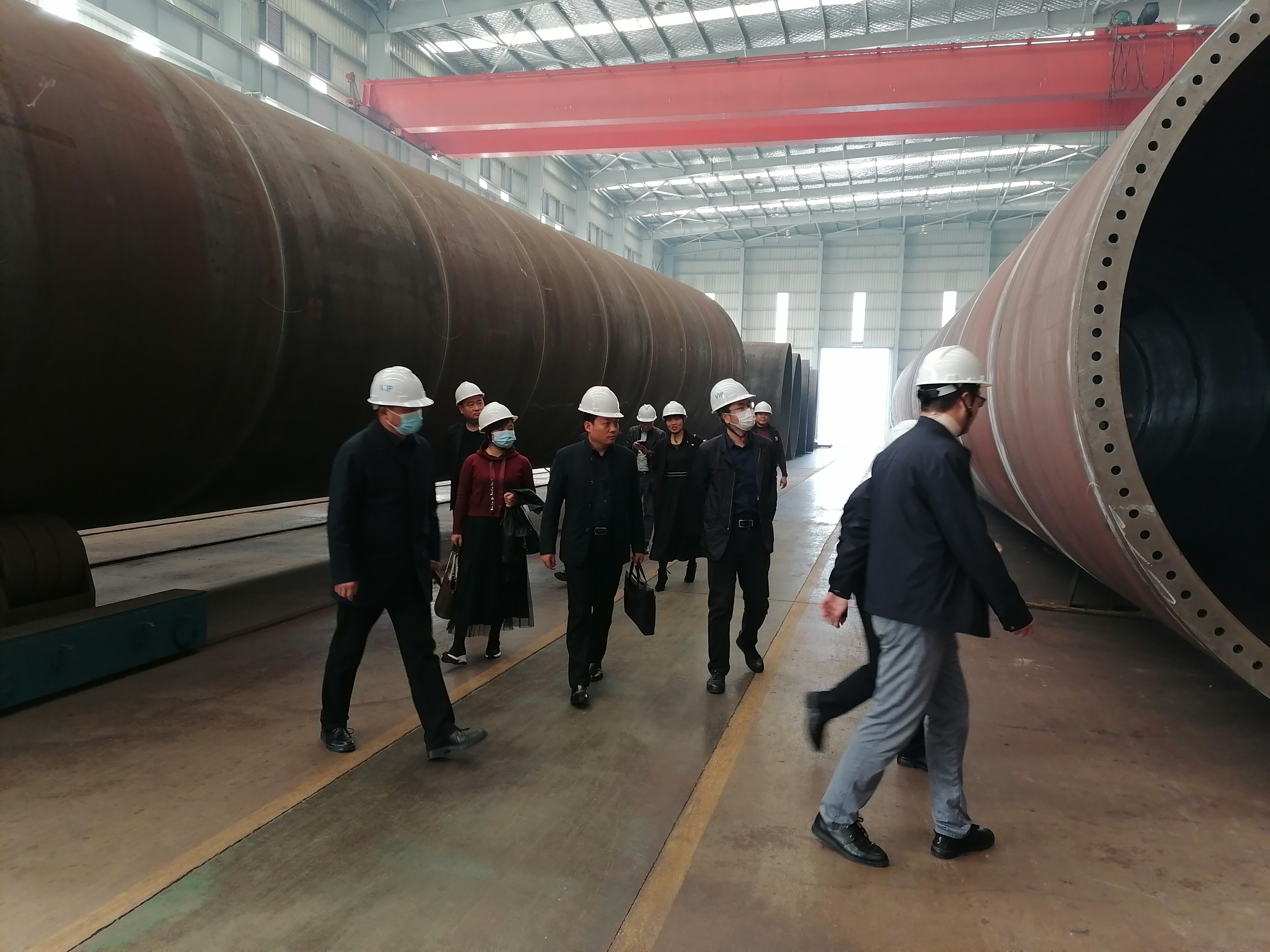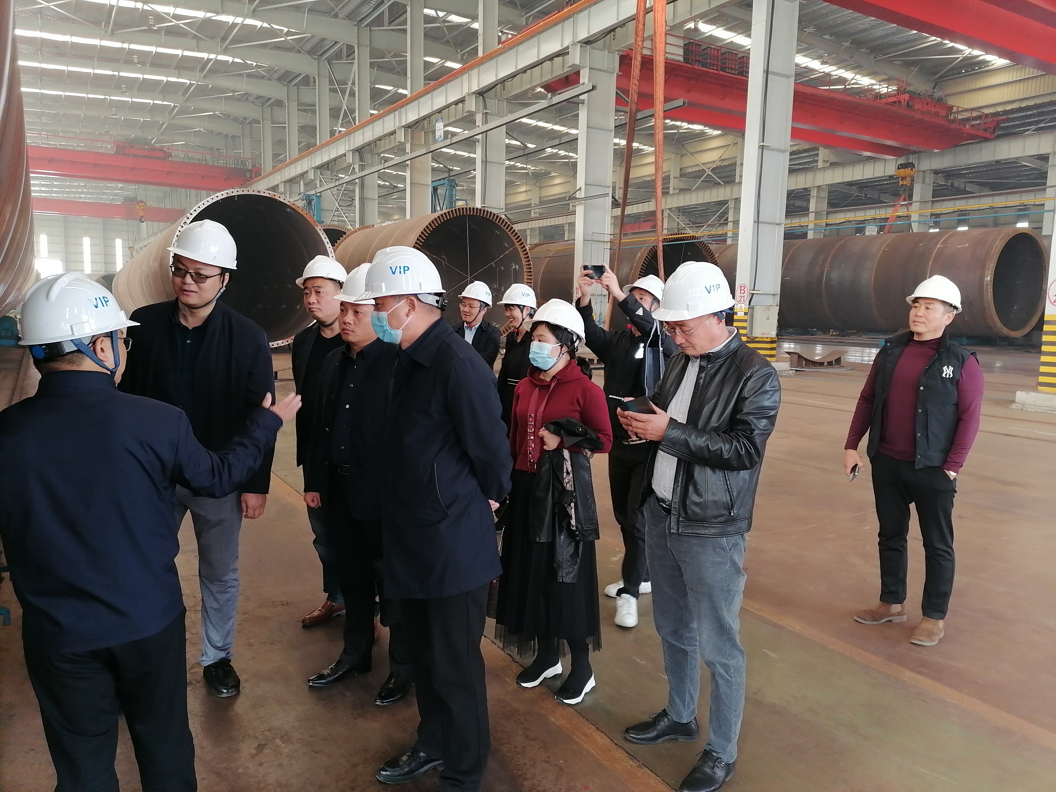 首先,大家走进青岛天能重工股份有限公司的生产厂房,参观了青岛天能生产的陆上风塔的具体流程,下料切割工艺,坡口加工技术以及组对焊接技术等各种精细技术。在参观过程中,胡总与方总为大家介绍了公司的各种先进设备,生产技术等硬件设施情况,以及经营范围,产品在全国内的战略布局等情况。