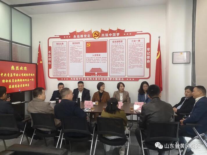 2021年4月21日,中共青岛市非公有制经济组织综合委员会韩劲松处长一行,来到商会对党支部组建准备工作进行指导帮促。商会会长梅青、副会长商干西、邓益群、章天林、梅伟、商会秘书长万君、办公室主任习亚胜及党员汪少华、王颖、刘娜参加了本次交流会。