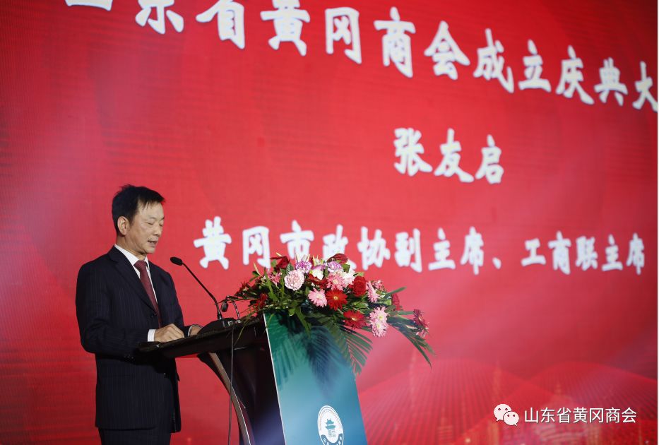 黄冈市政协副主席、黄冈市工商联主席张友启讲话,他首先对山东省黄冈商会的成立以及梅青会长为首的各位商会领导的顺利当选表达了热烈祝贺。张友启向各位嘉宾推介了市委、市政府大力推进能人回乡、促进精准扶贫和乡村振兴等招商引资政策,希望各位在鲁黄冈籍企业家们回乡投资兴业,为家乡振兴崛起贡献力量。他指出,山东省黄冈商会要担负起时代赋予的使命,坚持“政治建会、服务立会、活动兴会、改革强会”的宗旨,团结拼搏、积极进取、勇于担当、不断创新,力争打造一流的商会组织,不断开创商会工作的新局面。