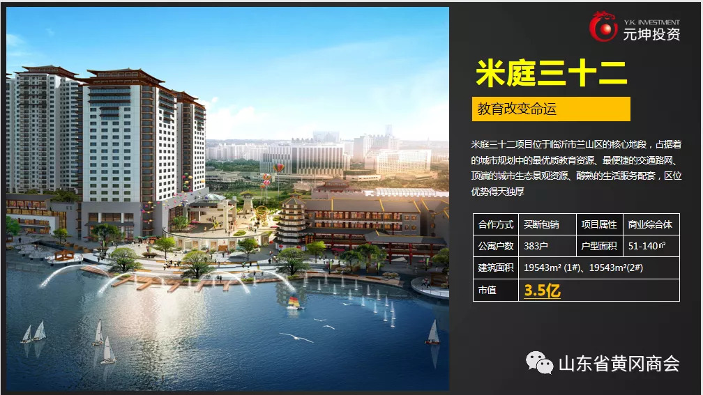 米庭三十二作为元坤投资数以百计的项目之一,其位于宏基兴都教育综合体板块,在山东省临沂市兰山区涑河南街北侧、花园街西侧,处于沂河、祊河、涑河三河交汇处;总建筑面积约4万方,项目采用古典式建筑风格,民水民电、全屋地暖、智慧社区,现房交付,毗邻临沂第三实验小学和第十二中学,在售产品建面约54-141㎡,是一个宜商宜住宜投资的教育产品。