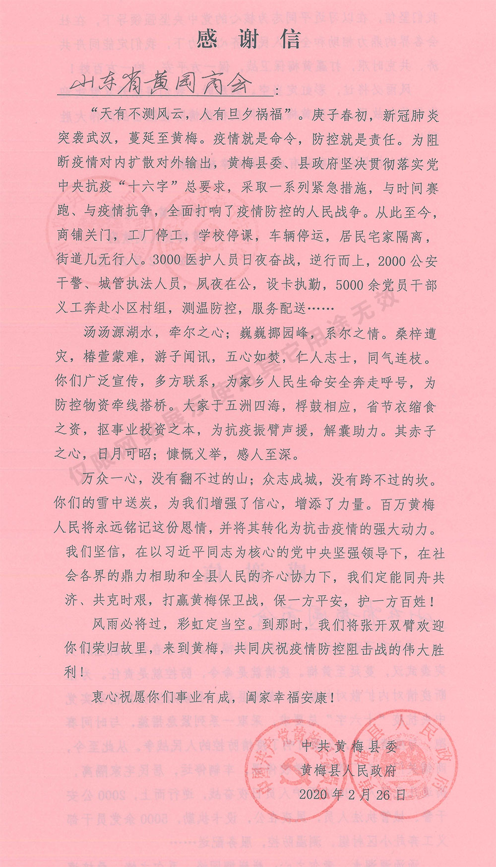 黄梅县人民政府感谢信